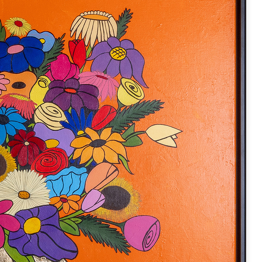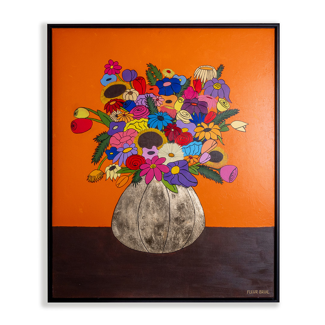 Flowers for my Friends is an ode to connection and gesture. Unlike my other works, this piece has no relief, but exudes strength through simplicity and sophistication. The metallic sheen in the vase captures the light, making the painting feel vibrant and playful.